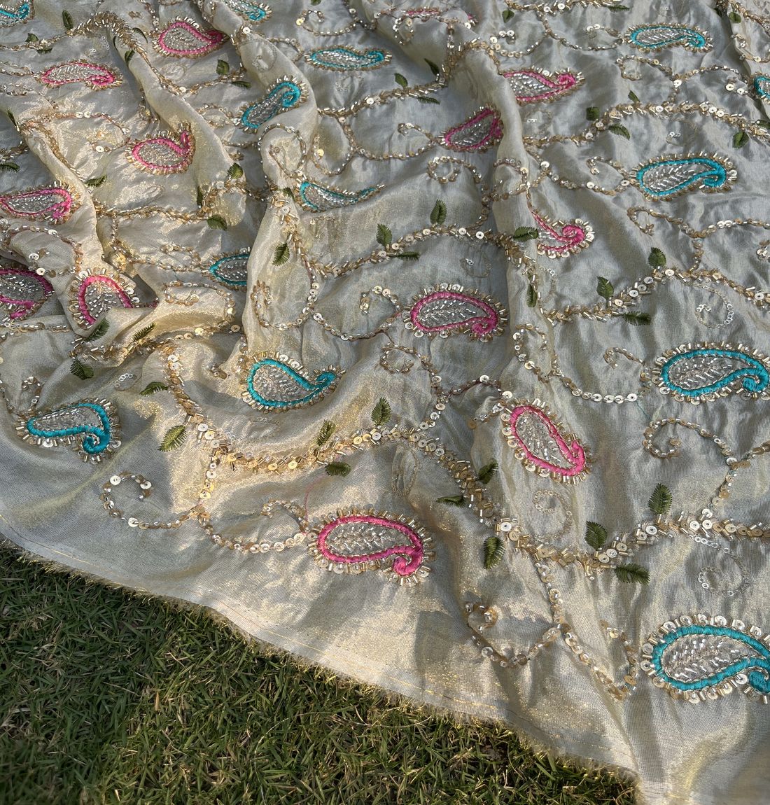 Aqua Blue Floral Sequins & Thread Embroidered Cotton Satin Fabric